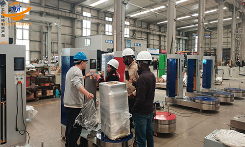 2024年6月23日,納米比亞客戶從廣州飛往濟(jì)南機(jī)場(chǎng)。抵達(dá)佳森工廠。Nick先生和Angela小姐接待了客戶,陪同客戶一起去佳森工廠考察,對(duì)機(jī)場(chǎng)行李纏繞機(jī)很感興趣。